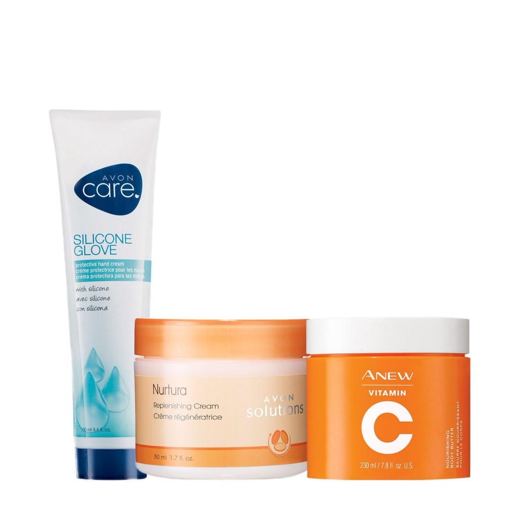 1. Moisturize Regularly: Use a rich hand cream containing hydrating ingredients like shea butter, glycerin, or hyaluronic acid. Apply it after washing your hands and before bed. Avon Care’s Silicone Glove skin-softening hand cream formula helps protect delicate hand skin. Smooth it over hands if they feel dry, or slather it on your hands before you do dishes or housework.