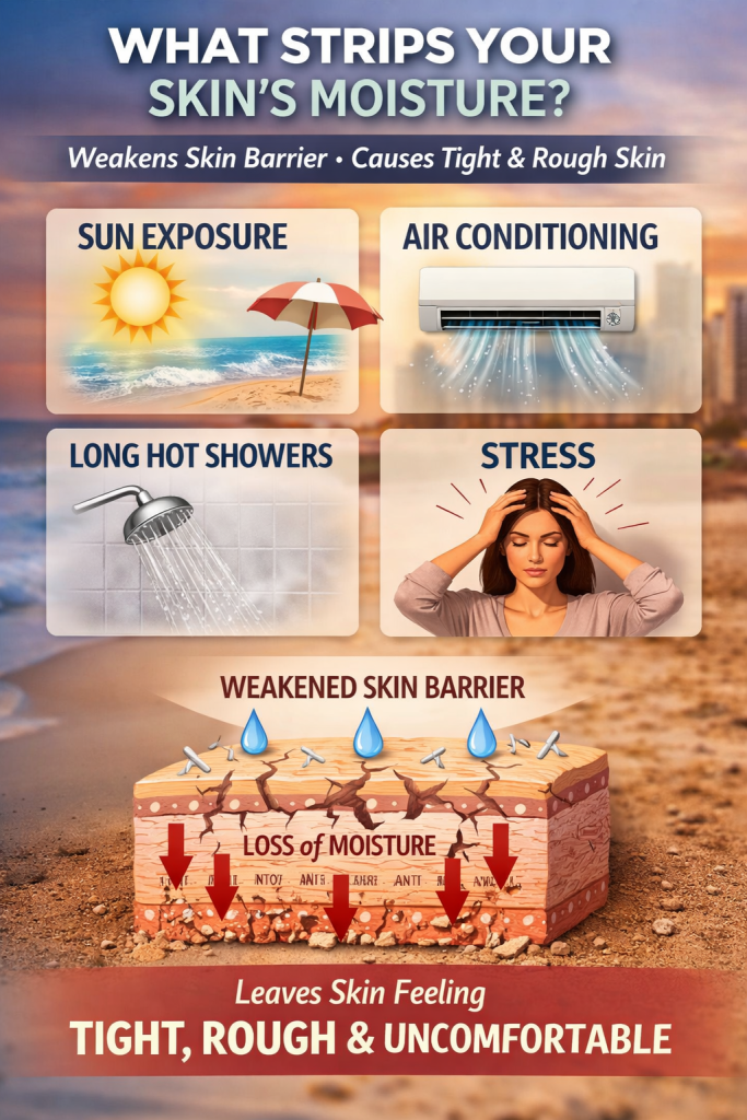 Environmental factors like sun exposure, air conditioning, long showers, and even stress can strip the skin of its natural moisture. When that happens, the skin barrier weakens, leaving skin feeling tight, rough, and uncomfortable.